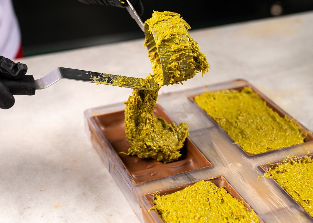 K osmaženému cestu pridajte pistáciovú pastu, štipku soli a nasekané pistácie. Takto pripravenú hmotu vylejte do formičiek alebo do sklenenej nádoby so stuhnutou čokoládou. Navrch vylejte zvyšnú čokoládu a nechajte v chladničke poriadne vychladnúť. Domáca dubajská čokoláda je hotová!