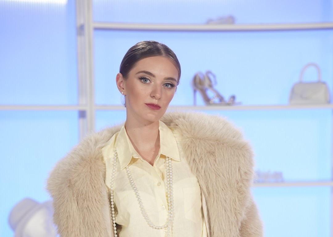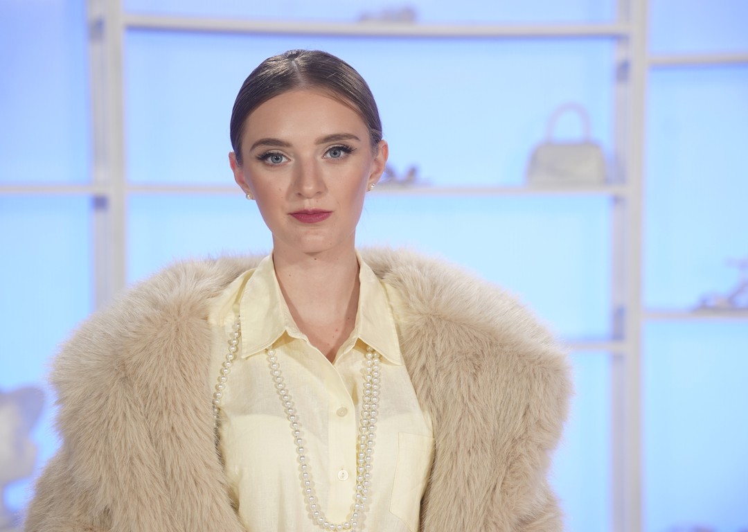 Piatková súťažiaca Natália postavila svoj súťažný outfit na maslovej košeli, ktorú skombinovala so skladanou sukňou, béžovým kožúškom, hnedými čižmami a smaragdovozelenou kabelkou. Pridala aj detaily v podobe perlového náhrdelníka a čipkovaných podväzkov. A práve tie sa pre jej súperky stali tŕňom v oku.