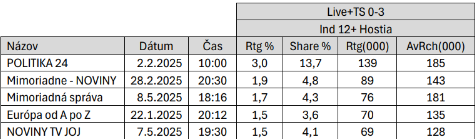 (2. 10. 2024 – 30. 9. 2025, najsilnejšie vydania relácií bez opakovania)