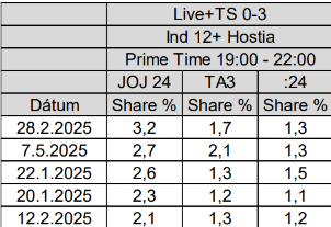 JOJ 24 je v spomínanom období víťazom v prime time v CS 12+. Dosahuje priemerný zásah 147-tisíc divákov (AvRch000) a celkovo za spomínané obdobie zasiahla viac ako 3-milióny divákov (Cov000).